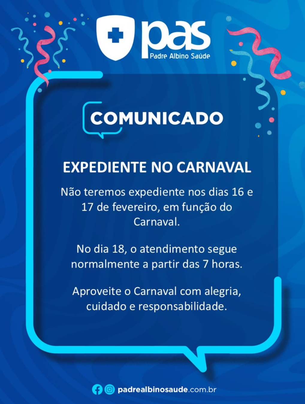 Expediente no Carnaval Organize-se e marque sua consulta antes ou depois do recesso de Carnaval! Esperamos por você! Aproveite com segurança e responsabilidade!