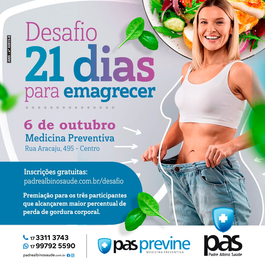 As inscrições estão abertas para a terceira edição de 2025 do Desafio 21 dias para emagrecer do Padre Albino Saúde. Gratuitas para beneficiários elas podem ser feitas pelo link www.padrealbinosaude.com.br/desafio. O desafio tem cronograma voltado para o emagrecimento e os participantes são acompanhados pela equipe da Medicina Preventiva – PAS Previne, composta por profissional de educação física, nutricionista, psicólogo e assistente social.