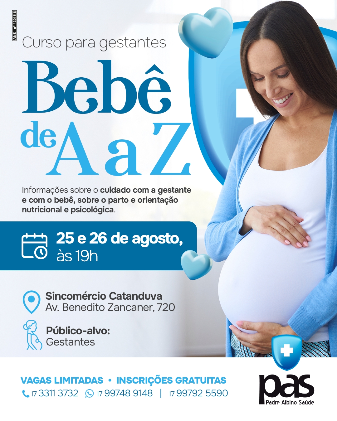Acontece nos dias 25 e 26 de agosto, das 19h às 22h, o Curso de Gestante Bebê de A a Z do Padre Albino Saúde (PAS). As inscrições podem ser feitas pelo 3311-3732, 17 99748 9148 ou 99792 5590. A participação é gratuita e as vagas limitadas.