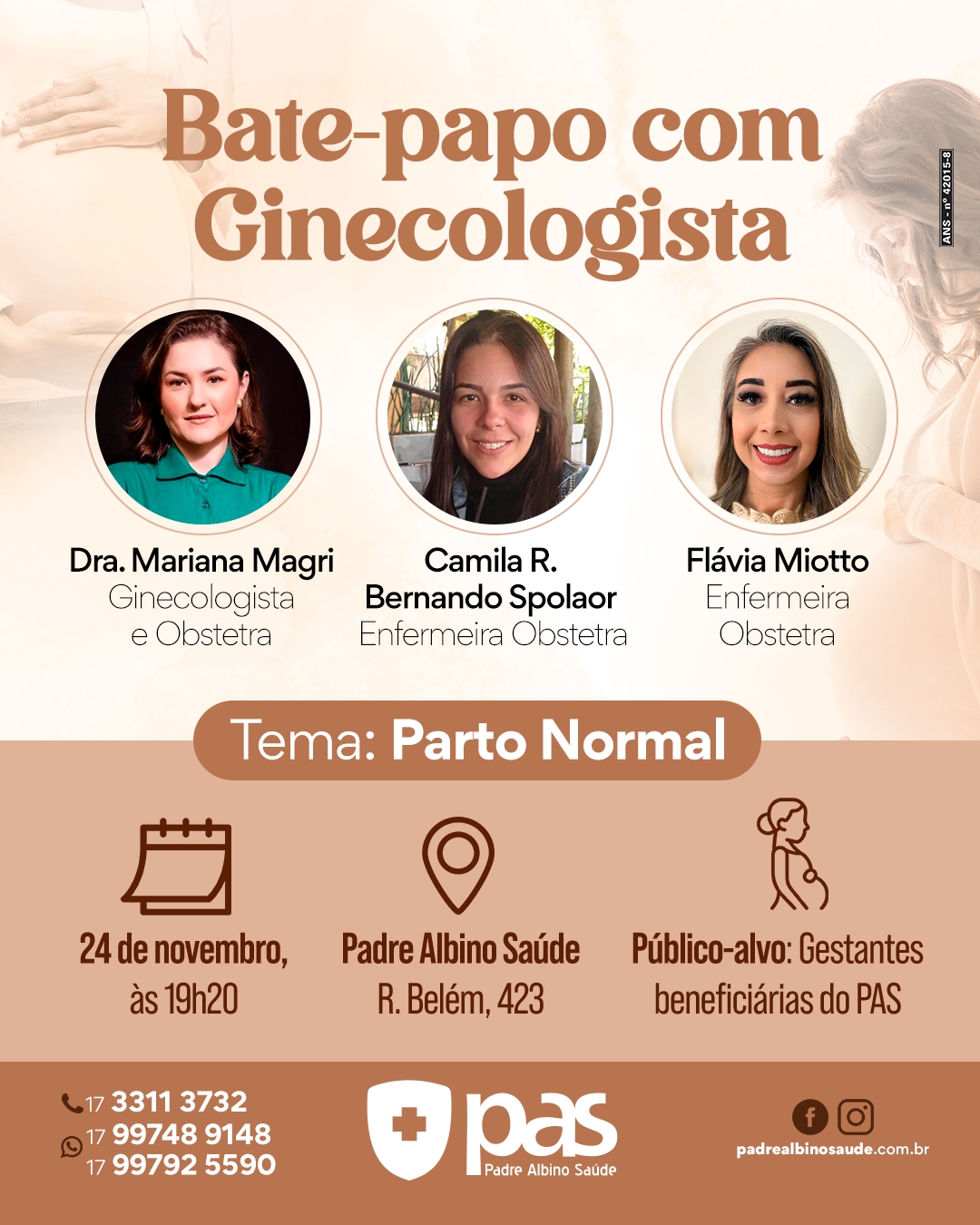 O Padre Albino Saúde (PAS) realiza no dia 24 de novembro, às 19h20, o “Bate-papo com Ginecologista”, voltado às beneficiárias do plano, com o tema parto normal. O encontro acontecerá na sede do PAS, localizada na Rua Belém, 423.